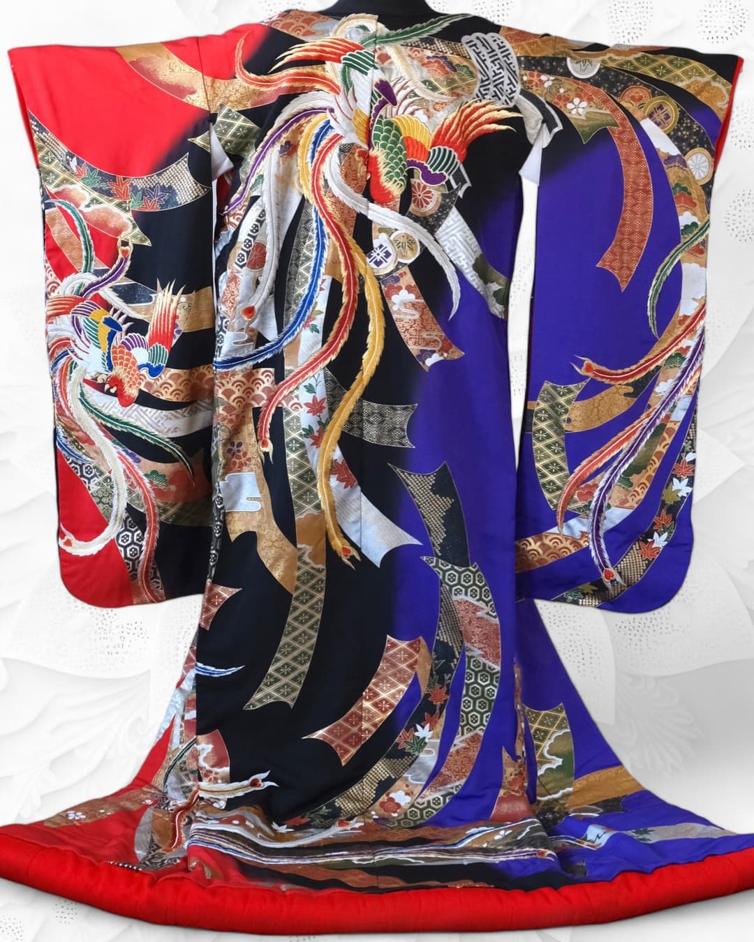 細部までこだわって描かれた鳳凰が大胆にあしらわれ、右から見れば『青紫と黒』の色打掛、左から見ると『紫と黒』の色打掛に見えます。