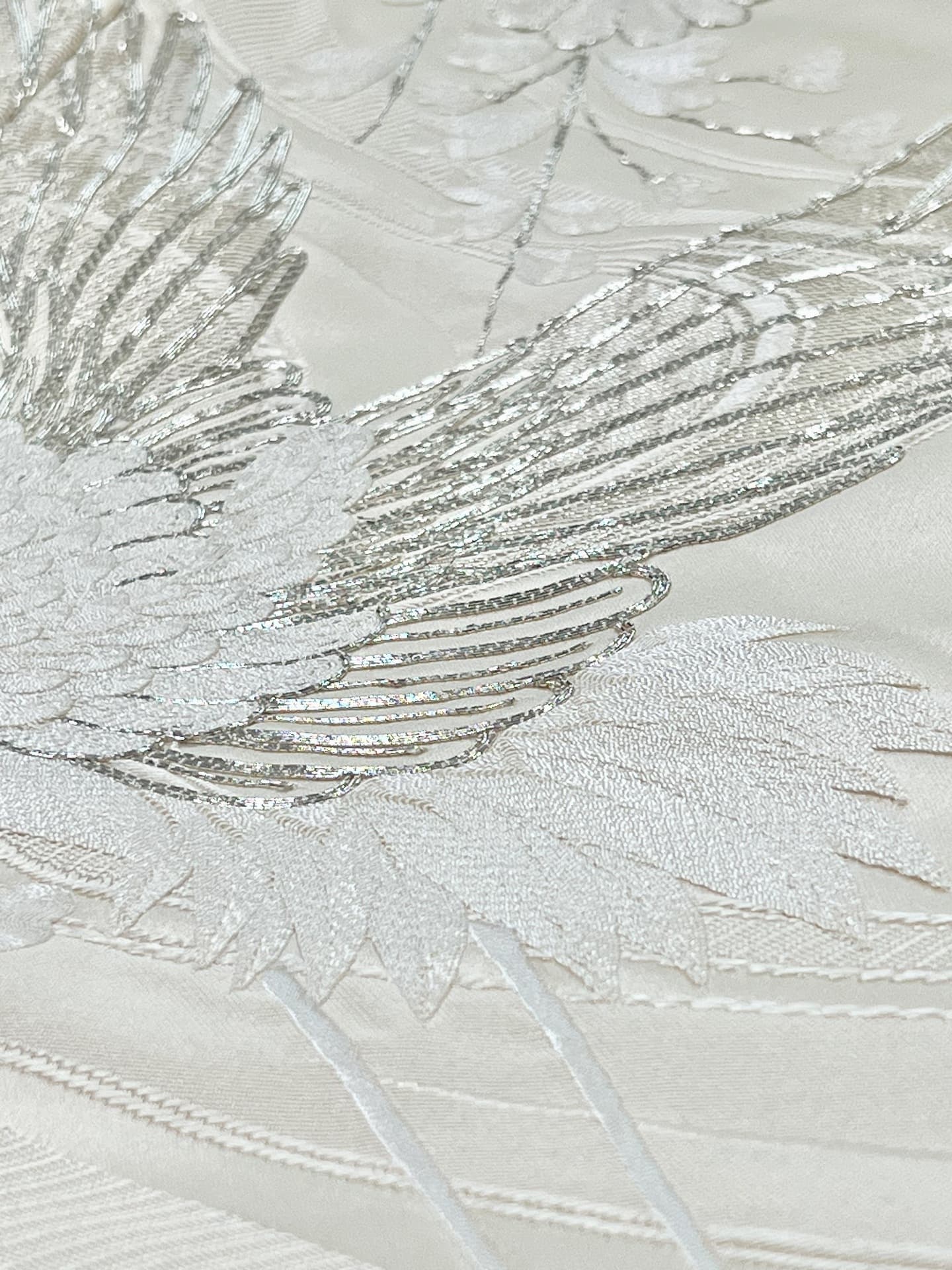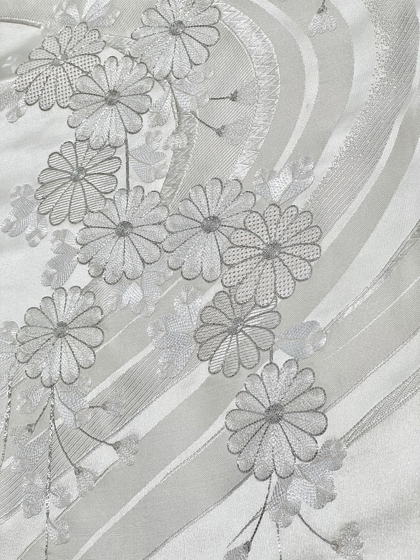 水紋に銀糸で描かれた花や鶴の刺繍が映え、とても華やかで美しい個性的な白無垢