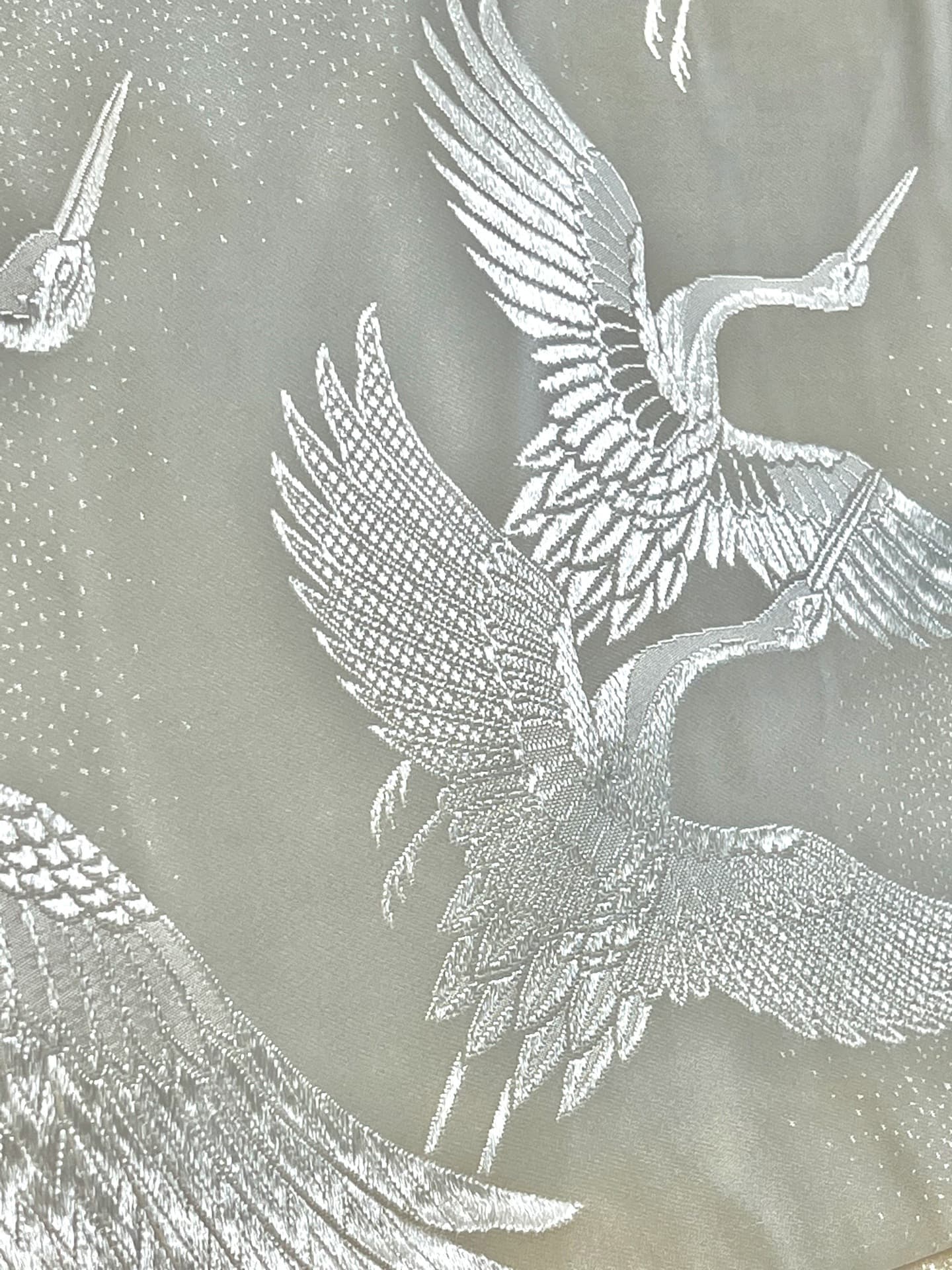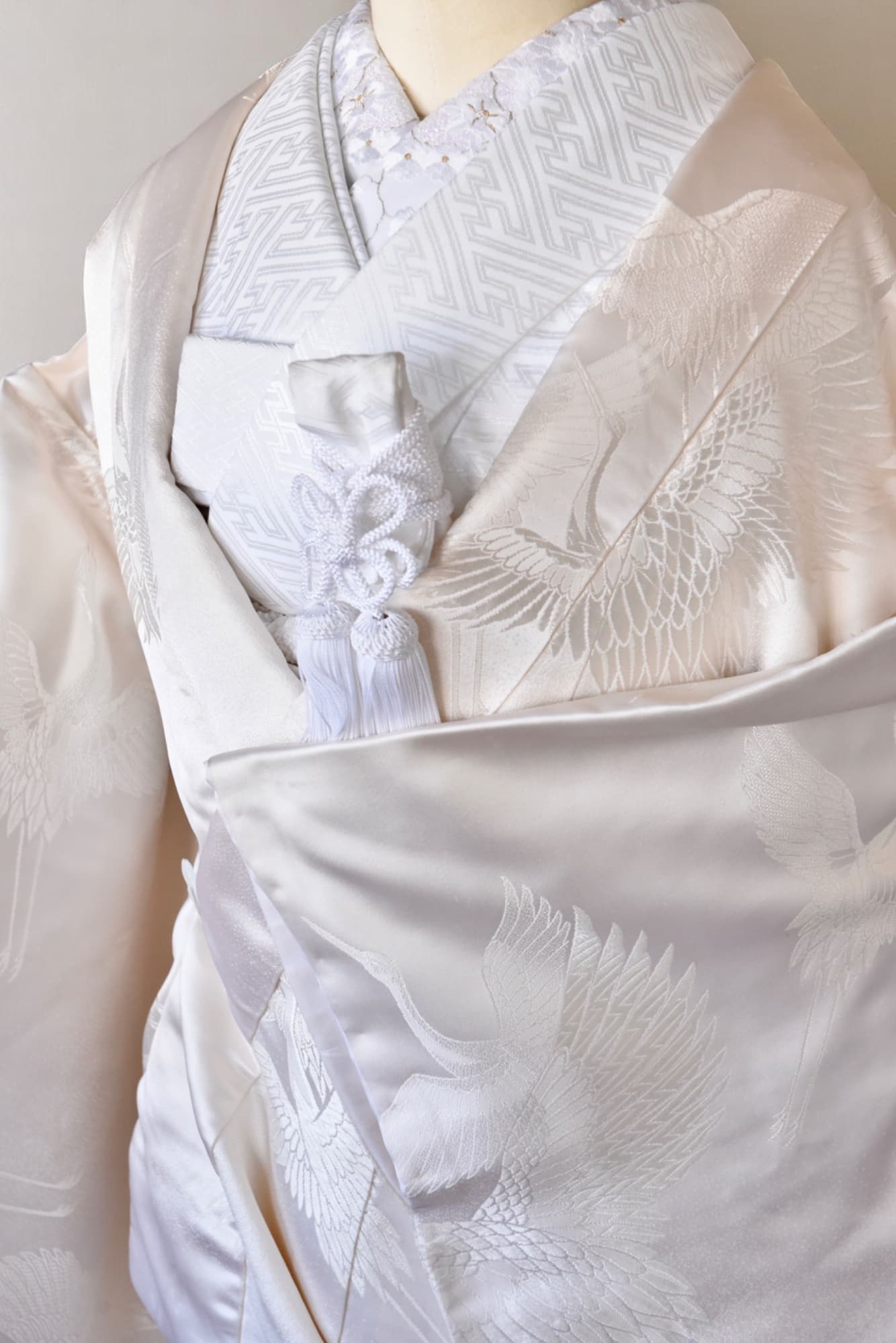 延命長寿の象徴とされる鶴が大きく美しく絹糸で描かれている白無垢です。